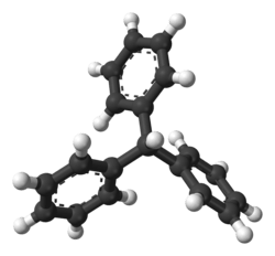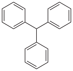 Triphenylmethane or triphenyl methane (sometimes also known as Tritan), is the hydrocarbon with the formula (C6H5)3CH. This colorless solid is soluble in nonpolar organic solvents and not in water. Triphenylmethane is the basic skeleton of many synthetic dyes called triarylmethane dyes, many of them are pH indicators, and some display fluorescence. A trityl group in organic chemistry is a triphenylmethyl group Ph3C, e.g. triphenylmethyl chloride (trityl chloride) and the triphenylmethyl radical (trityl radical).