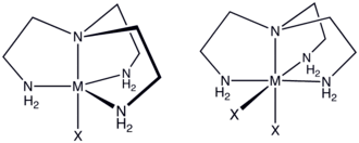Tren is a C3-symmetric, tetradentate chelating ligand that forms stable complexes with transition metals, especially those in the 2+ and 3+ oxidation states. Tren complexes exist with relatively few isomers, reflecting the constrained connectivity of this tetramine. Thus, only a single achiral stereoisomer exists for [Co(tren)X2]+, where X is halide or pseudohalide.[5] In contrast, for [Co(trien)X2]+ five diastereomers are possible, four of which are chiral. In a few cases, tren serves as a tridentate ligand with one of the primary amine groups non-coordinated. Tren is a common impurity in the more common triethylenetetramine ("trien"). As a trifunctional amine, tren forms a triisocyanate when derivatized with COCl2.