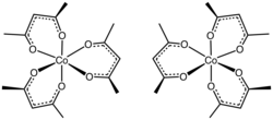 The structure of the complex has been confirmed by X-ray crystallography. The three acac− ligands bind in a bidentate fashion to cobalt, defining an octahedral complex.[2] The solid is isomorphous with tris(acetylacetonato)iron(III), tris(acetylacetonato)manganese(III), and tris(acetylacetonato)aluminium. With D3-symmetry, these complexes are chiral and often can be resolved into the individual enantiomers.