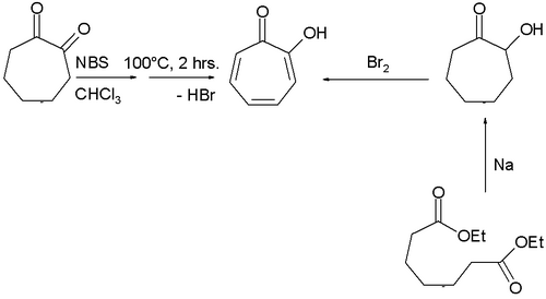 Many methods have been described for the synthesis of tropolone.[3] One involves bromination of 1,2-cycloheptanedione with N-bromosuccinimide followed by dehydrohalogenation at elevated temperatures, while another uses acyloin condensation of the ethyl ester of pimelic acid the acyloin again followed by oxidation by bromine.[4]