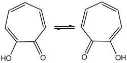 The carbonyl group is also highly polarized, as common for tropones. There can be substantial hydrogen bonding between it and the hydroxyl group, leading to rapid tautomerization: the structure is symmetric on the NMR timescale.[6]