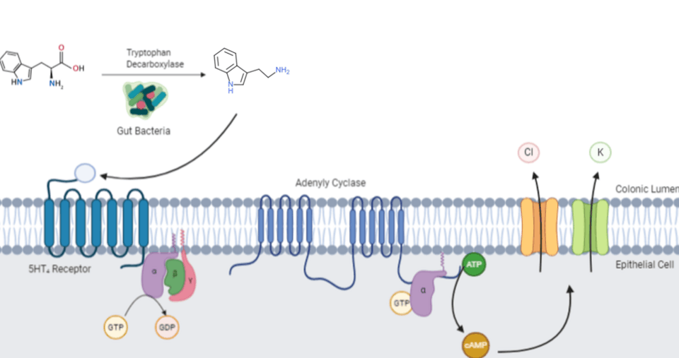 Tryptamine produced by mutualistic bacteria in the human gut activates serotonin GPCRs ubiquitously expressed along the colonic epithelium.[17] Upon tryptamine binding, the activated 5-HT4 receptor undergoes a conformational change which allows its Gs alpha subunit to exchange GDP for GTP, and its liberation from the 5-HT4 receptor and βγ subunit.[17] GTP-bound Gs activates adenylyl cyclase, which catalyzes the conversion of ATP into cyclic adenosine monophosphate (cAMP).[17] cAMP opens chloride and potassium ion channels to drive colonic electrolyte secretion and promote intestinal motility.[18][40]