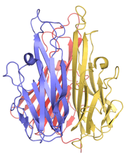 The secreted extracellular portion, denoted sTNF, consists of 157 amino acids.[22] Unlike tmTNF, sTNF can only bind to TNFR1.[10] The secondary structure of sTNF consists primarily of alternating strands that join into two sheets, known as antiparallel β-sheets. The two sheets are layered on top of each other, forming a wedge shape known as an antiparallel β-sandwich. Remarkably, this structure is similar to those seen on the coats of viruses. The last 9 residues of the C-terminus are locked into the middle strand of the bottom sheet, and are necessary for bioactivity.[22]