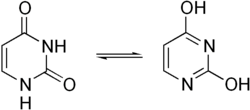 Uracil undergoes amide-imidic acid tautomeric shifts because any nuclear instability the molecule may have from the lack of formal aromaticity is compensated by the cyclic-amidic stability.[5] The amide tautomer is referred to as the lactam structure, while the imidic acid tautomer is referred to as the lactim structure. These tautomeric forms are predominant at pH 7. The lactam structure is the most common form of uracil.