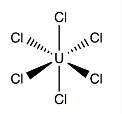 Uranium hexachloride is the inorganic compound with the formula UCl6. It features uranium in the +6 oxidation state.[1] UCl6 hydrolyzes readily but is stable under inert atmosphere. It is soluble in carbon tetrachloride (CCl4). It is a multi-luminescent dark green or black solid with a vapor pressure between 1-3 mmHg at 373.15 K.[2]