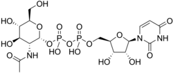 Uridine diphosphate N-acetylglucosamine or UDP-GlcNAc is a nucleotide sugar and a coenzyme in metabolism. It is used by glycosyltransferases to transfer N-acetylglucosamine residues to substrates. UDP-GlcNAc is used for making glycosaminoglycans, proteoglycans, and glycolipids.[1] D-Glucosamine is made naturally in the form of glucosamine-6-phosphate, and is the biochemical precursor of all nitrogen-containing sugars.[2] To be specific, glucosamine-6-phosphate is synthesized from fructose 6-phosphate and glutamine[3] as the first step of the hexosamine biosynthesis pathway.[4] The end-product of this pathway is UDP-GlcNAc. Some enzymes involved in the biosynthesis of UDP-GlcNAc vary between prokaryotic and eukaryotic organisms, serving as potential drug targets for antibiotic development.[5]