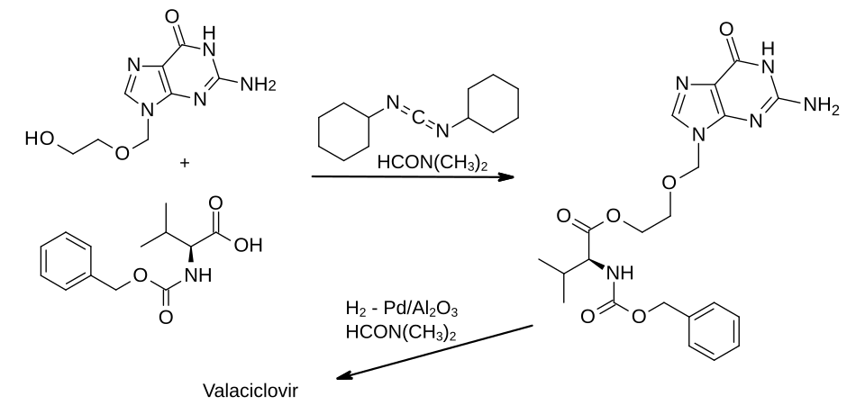Aciclovir was esterified with a carboxybenzyl protected valine, using dicyclohexylcarbodiimide as the dehydrating agent. In the final step, the protecting group was removed by hydrogenation using a palladium on alumina catalyst.[23][24]