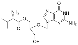Valganciclovir is a prodrug for ganciclovir, which is a synthetic analog of 2′-deoxy-guanosine. Its structure is the same as ganciclovir, except for the addition of a L-valyl ester at the 5' end of the incomplete deoxyribose ring. The valine increases both the absorption of the drug in the intestines, as well as the bioavailability of the drug once it is absorbed. The L-valyl ester is cleaved by esterases in the intestines and the liver, leaving ganciclovir to be absorbed by the virus-infected cells.[8]