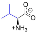 Valine (symbol Val or V)[4] is an α-amino acid that is used in the biosynthesis of proteins. It contains an α-amino group (which is in the protonated −NH3+ form under biological conditions), an α-carboxylic acid group (which is in the deprotonated −COO− form under biological conditions), and a side chain isopropyl group, making it a non-polar aliphatic amino acid. Valine is essential in humans, meaning the body cannot synthesize it; it must be obtained from dietary sources which are foods that contain proteins, such as meats, dairy products, soy products, beans and legumes. It is encoded by all codons starting with GU (GUU, GUC, GUA, and GUG).