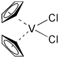 Vanadocene dichloride is an organometallic complex with formula (η5-C5H5)2VCl2 (commonly abbreviated as Cp2VCl2). It is a structural analogue of titanocene dichloride but with vanadium(IV) instead of titanium(IV). This compound has one unpaired electron, hence Cp2VCl2 is paramagnetic. Vanadocene dichloride is a suitable precursor for variety of bis(cyclopentadienyl)vanadium(IV) compounds.