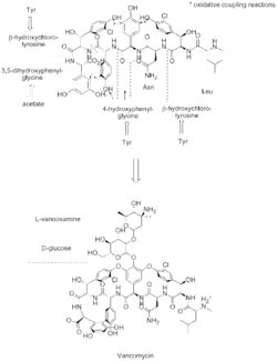 - ^ a b c van Wageningen AM, Kirkpatrick PN, Williams DH, Harris BR, Kershaw JK, Lennard NJ, et al. (March 1998). "Sequencing and analysis of genes involved in the biosynthesis of a vancomycin group antibiotic". Chemistry & Biology. 5 (3): 155–62. doi:10.1016/S1074-5521(98)90060-6. PMID 9545426.
