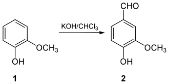 Vanillin was first isolated as a relatively pure substance in 1858 by Théodore Nicolas Gobley, who obtained it by evaporating a vanilla extract to dryness and recrystallizing the resulting solids from hot water.[7] In 1874, the German scientists Ferdinand Tiemann and Wilhelm Haarmann deduced its chemical structure, at the same time finding a synthesis for vanillin from coniferin, a glucoside of coniferyl alcohol found in pine bark.[8] Tiemann and Haarmann founded a company Haarmann and Reimer (now part of Symrise) and started the first industrial production of vanillin using their process (now known as the Reimer–Tiemann reaction) in Holzminden, Germany. In 1876, Karl Reimer synthesized vanillin (2) from guaiacol (1).[9]