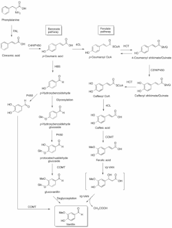 Although the exact route of vanillin biosynthesis in V. planifolia is currently unknown, several pathways are proposed for its biosynthesis. Vanillin biosynthesis is generally agreed to be part of the phenylpropanoid pathway starting with L-phenylalanine,[31] which is deaminated by phenylalanine ammonia lyase (PAL) to form t-cinnamic acid. The para position of the ring is then hydroxylated by the cytochrome P450 enzyme cinnamate 4-hydroxylase (C4H/P450) to create p-coumaric acid.[32] Then, in the proposed ferulate pathway, 4-hydroxycinnamoyl-CoA ligase (4CL) attaches p-coumaric acid to coenzyme A (CoA) to create p-coumaroyl CoA. Hydroxycinnamoyl transferase (HCT) then converts p-coumaroyl CoA to 4-coumaroyl shikimate/quinate. This subsequently undergoes oxidation by the P450 enzyme coumaroyl ester 3'-hydroxylase (C3'H/P450) to give caffeoyl shikimate/quinate. HCT then exchanges the shikimate/quinate for CoA to create caffeoyl CoA, and 4CL removes CoA to afford caffeic acid. Caffeic acid then undergoes methylation by caffeic acid O-methyltransferase (COMT) to give ferulic acid. Finally, vanillin synthase hydratase/lyase (vp/VAN) catalyzes hydration of the double bond in ferulic acid followed by a retro-aldol elimination to afford vanillin.[32] Vanillin can also be produced from vanilla glycoside with the additional final step of deglycosylation.[27] In the past p-hydroxybenzaldehyde was speculated to be a precursor for vanillin biosynthesis. However, a 2014 study using radiolabelled precursor indicated that p-hydroxybenzaldehyde is not used to synthesise vanillin or vanillin glucoside in the vanilla orchids.[32]
