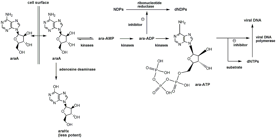 Vidarabine works by interfering with the synthesis of viral DNA.[4] It is a nucleoside analog and therefore has to be phosphorylated to be active. This is a three-step process in which vidarabine is sequentially phosphorylated by kinases to the triphosphate ara-ATP. This is the active form of vidarabine and is both an inhibitor and a substrate of viral DNA polymerase.[5]
