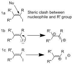 Vinyl iodides are generally stable under nucleophilic conditions. In SN2 reactions, back-attack is difficult because of steric clash of R groups on carbon adjacent to electrophilic center (see figure 1a).[2] In addition, the lone pair on iodide donates into the π* of the alkene, which reduces electrophilic character on the carbon as a result of decreased positive charge. Also, this stereoelectronic effect strengthens the C-I bond, thus making removal of the iodide difficult (see figure 1b).[3] In SN1 case, dissociation is difficult because of the strengthened C-I bond and loss of the iodide will generate an unstable carbocation(see figure 1c)[2]