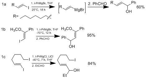 Besides using vinyl iodides as useful substrates in transition metal cross-coupling reaction, they can also undergo elimination with a strong base to give corresponding alkyne, and they can be converted to suitable vinyl Grignard reagents. Vinyl iodides are converted to Grignard reagents by magnesium-halogen exchange (see Scheme 1a).[8] The scope of this synthetic method is limited since it requires higher temperatures and longer reaction time, which affects functional group tolerance. However, vinyl iodide with electron withdrawing group can enhance rate of exchange(see Scheme 1b).[8] Also addition of lithium chloride helps enhance magnesium-halogen exchange (see Scheme 1c). It is predicted lithium chloride breaks up aggregates in organomagnesium reagents.[9]