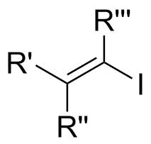 In organic chemistry, a vinyl iodide (also known as an iodoalkene) functional group is an alkene with one or more iodide substituents (i.e. a carbon-carbon double bond where one or both of the carbons is bound to an iodine). Vinyl iodides are versatile molecules that serve as important building blocks and precursors in organic synthesis. They are commonly used in transition-metal catalyzed cross-coupling reactions which form carbon-carbon bonds, such as the Stille reaction, Heck reaction, Sonogashira coupling, and Suzuki coupling.[1] Synthesis of vinyl iodides with well-defined geometry is important in stereoselective synthesis of natural products and drugs.