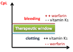Vitamin K1-warfarin interaction effect: When warfarin levels are high, people have more risk of bleeding. Conversely, lower levels of warfarin lead to increased risk of blood clots. A narrow range exists where the benefits of warfarin are greater than the risks, its therapeutic window. Certain drugs, herbal medicines, and foods can interact with warfarin, increasing or decreasing a previously stable warfarin level.[28]