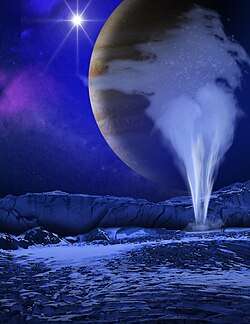 Geological formations such as cryogeysers are thought to exist on the surface of several icy moons ejecting water vapor due to tidal heating and may indicate the presence of substantial quantities of subsurface water. Plumes of water vapor have been detected on Jupiter's moon Europa and are similar to plumes of water vapor detected on Saturn's moon Enceladus.[61] Traces of water vapor have also been detected in the stratosphere of Titan.[63] Water vapor has been found to be a major constituent of the atmosphere of dwarf planet, Ceres, largest object in the asteroid belt[64] The detection was made by using the far-infrared abilities of the Herschel Space Observatory.[65] The finding is unexpected because comets, not asteroids, are typically considered to "sprout jets and plumes." According to one of the scientists, "The lines are becoming more and more blurred between comets and asteroids."[65] Scientists studying Mars hypothesize that if water moves about the planet, it does so as vapor.[66]