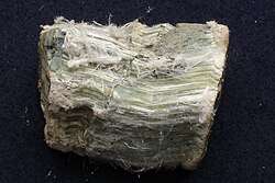 Chrysotile (/ˈkrɪsəˌtʌɪl/, /ˈkrɪsəˌtaɪl/, or /ˈkrɪsətɪl/)[5][6] or white asbestos is the most commonly encountered form of asbestos,[7] accounting for approximately 95% of the asbestos in the United States[8] and a similar proportion in other countries.[9] It is a soft, fibrous silicate mineral in the serpentine subgroup of phyllosilicates; as such, it is distinct from other asbestiform minerals in the amphibole group. Its idealized chemical formula is Mg3(Si2O5)(OH)4.[7] The material has physical properties which make it desirable for inclusion in building materials, but poses serious health risks when dispersed into air and inhaled.