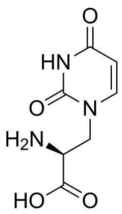 Willardiine (correctly spelled with two successive i's) or (S)-1-(2-amino-2-carboxyethyl)pyrimidine-2,4-dione is a chemical compound that occurs naturally in the seeds of Mariosousa willardiana and Acacia sensu lato.[1] The seedlings of these plants contain enzymes capable of complex chemical substitutions that result in the formation of free amino acids (See: #Synthesis). Willardiine is frequently studied for its function in higher level plants. Additionally, many derivates of willardiine are researched for their potential in pharmaceutical development.[1] Willardiine was discovered in 1959 by R. Gmelin, when he isolated several free, non-protein amino acids from Acacia willardiana (another name for Mariosousa willardiana) when he was studying how these families of plants synthesize uracilyalanines.[2] A related compound, Isowillardiine, was concurrently isolated by a different group, and it was discovered that the two compounds had different structural and functional properties.[3] Subsequent research on willardiine has focused on the functional significance of different substitutions at the nitrogen group and the development of analogs of willardiine with different pharmacokinetic properties. In general, Willardiine is one of the first compounds studied in which slight changes to molecular structure result in compounds with significantly different pharmacokinetic properties.[4]