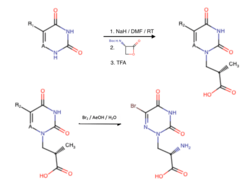 The lower binding affinity of willardiine for the AMPA and kainate receptors can be attributed to the unsubstituted carbon on position 5 of the 6-membered ring. Substitutions of large, electron-withdrawing groups at this position increase the affinity for kainate receptors but decrease the binding affinity for AMPA receptors.[6] An example of the synthesis of one analog, 5-bromowillardiine, is shown in Figure 6.