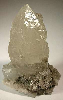 Witherite crystallizes in the orthorhombic system. The crystals are invariably twinned together in groups of three, giving rise to pseudo-hexagonal forms somewhat resembling bipyramidal crystals of quartz, the faces are usually rough and striated horizontally.[13] It transforms into an hexagonal phase at 1084 K that changes into a cubic phase at 1254 K. The mineral is named after William Withering, who in 1784 recognized it to be chemically distinct from barytes.[14] It occurs in veins of lead ore at Hexham in Northumberland, Alston in Cumbria, Anglezarke, near Chorley in Lancashire and a few other localities. Witherite is readily altered to barium sulfate by the action of water containing calcium sulfate in solution and crystals are therefore frequently encrusted with barytes. It is the chief source of barium salts and is mined in considerable amounts in Northumberland. It is used for the preparation of rat poison, in the manufacture of glass and porcelain, and formerly for refining sugar.[13] It is also used for controlling the chromate to sulfate ratio in chromium electroplating baths.[15]