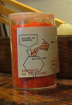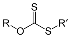 A xanthate is a salt or ester of a xanthic acid. The formula of the salt of xanthic acid is [R−O−CS2]M+ (where R is organyl group and M is usually Na or K).[1] Xanthate also refers to the anion [R−O−CS2]. The formula of a xanthic acid is R−O−C(=S)−S−H, such as ethyl xanthic acid, while the formula of a xanthate ester is R−O−C(=S)−S−R', where R and R' are organyl groups. The salts of xanthates are sometimes called O-organyl dithioates. The esters of xanthic acid are sometimes called O,S-diorganyl esters of dithiocarbonic acid. The name xanthate is derived from Ancient Greek ξανθός (xanthos) meaning 'yellowish' or 'golden', and indeed most xanthate salts are yellow. They were discovered and named in 1823 by Danish chemist William Christopher Zeise. These organosulfur compounds are important in two areas: the production of cellophane and related polymers from cellulose and (in mining) for extraction of certain sulphide bearing ores.[2] They are also versatile intermediates in organic synthesis.