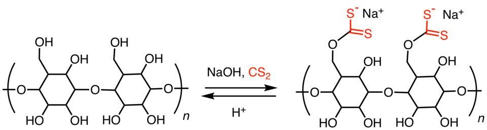 Cellulose reacts with carbon disulfide (CS2) in presence of sodium hydroxide (NaOH) to produces sodium cellulose xanthate, which upon neutralization with sulfuric acid (H2SO4) gives viscose rayon or cellophane paper (Sellotape or Scotch Tape).