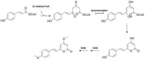 Yangonin is biosynthesized from coumaroyl-CoA and malonyl-CoA.
