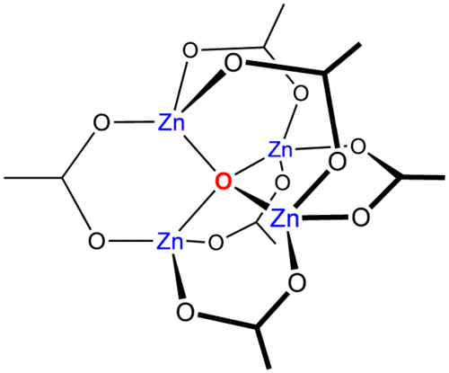 - ^ Koyama, H.; Saito, Y. (1954). "The Crystal Structure of Zinc Oxyacetate, Zn4O(CH3COO)6". Bull. Chem. Soc. Jpn. 27 (2): 112–114. doi:10.1246/bcsj.27.112.