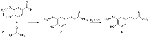 Nomura identified and later patented a method for the synthesis of zingerone, in which vanillin and acetone are reacted under basic conditions (via an Aldol condensation) to form dehydrozingerone. This compound is obtained in about 95% quantity.[4] This reaction is followed by catalytic hydrogenation of the intermediate compound in order to form zingerone, obtained in approximately 100% quantity.[5]