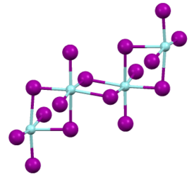 Like most binary metal halides, zirconium(IV) iodide adopts a polymeric structure. As characterized by X-ray crystallography, the compound consists of octahedral Zr(IV) centers interconnected by four doubly bridging iodide ligands. The Zr-I distances of 2.692 (terminal) and 3.030 Å[2][3]