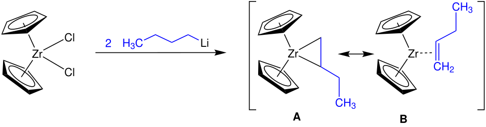Zirconocene dichloride can also be used to prepare the Negishi reagent, Cp2Zr(η2-butene), which can be used as a source of Cp2Zr in oxidative cyclisation reactions. The Negishi reagent is prepared by treating zirconocene dichloride with n-BuLi, leading to replacement of the two chloride ligands with butyl groups. The dibutyl compound subsequently undergoes beta-hydride elimination to give one η2-butene ligand, with the other butyl ligand promptly lost as butane via reductive elimination.[4]