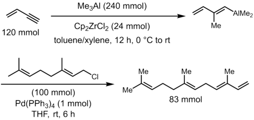 Zirconocene dichloride catalyzes the carboalumination of alkynes by trimethylaluminium to give a (alkenyl)dimethylalane, a versatile intermediate for further cross coupling reactions for the synthesis of stereodefined trisubstituted olefins. For example, α-farnesene can be prepared as a single stereoisomer by carboalumination of 1-buten-3-yne with trimethylaluminium, followed by palladium-catalyzed coupling of the resultant vinylaluminium reagent with geranyl chloride.[5]