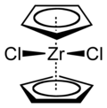 Zirconocene dichloride is an organozirconium compound composed of a zirconium central atom, with two cyclopentadienyl and two chloro ligands. It is a colourless diamagnetic solid that is somewhat stable in air.
