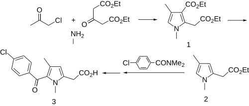 Zomepirac can be synthesized from diethyl 1,3-acetonedicarboxylate, chloroacetone, and aqueous methylamine (MeNH2) via modification of the Hantzsch pyrrole synthesis to give intermediate 1. Saponification, monoesterification, and thermal decarboxylation gives ester 2. This is acylated with N,N-dimethyl-p-chlorobenzamide, and finally saponification gives zomepirac (3).