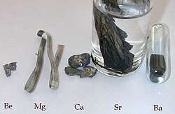 The alkaline earth metals are six chemical elements in group 2 of the periodic table. They are beryllium (Be), magnesium (Mg), calcium (Ca), strontium (Sr), barium (Ba), and radium (Ra).[1] The elements have very similar properties: they are all shiny, silvery-white, somewhat reactive metals at standard temperature and pressure.[2]