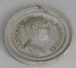 Antimony was frequently described in alchemical manuscripts, including the Summa Perfectionis of Pseudo-Geber, written around the 14th century.[44] A description of a procedure for isolating antimony is later given in the 1540 book De la pirotechnia by Vannoccio Biringuccio,[45] predating the more famous 1556 book by Agricola, De re metallica. In this context Agricola has been often incorrectly credited with the discovery of metallic antimony. The book Currus Triumphalis Antimonii (The Triumphal Chariot of Antimony), describing the preparation of metallic antimony, was published in Germany in 1604. It was purported to be written by a Benedictine monk, writing under the name Basilius Valentinus in the 15th century; if it were authentic, which it is not, it would predate Biringuccio.[b][48]
