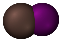 Astatine is known to react with its lighter homologs iodine, bromine, and chlorine in the vapor state; these reactions produce diatomic interhalogen compounds with formulas AtI, AtBr, and AtCl.[55] The first two compounds may also be produced in water – astatine reacts with iodine/iodide solution to form AtI, whereas AtBr requires (aside from astatine) an iodine/iodine monobromide/bromide solution. The excess of iodides or bromides may lead to AtBr−2 and AtI−2 ions,[55] or in a chloride solution, they may produce species like AtCl−2 or AtBrCl− via equilibrium reactions with the chlorides.[56] Oxidation of the element with dichromate (in nitric acid solution) showed that adding chloride turned the astatine into a molecule likely to be either AtCl or AtOCl. Similarly, AtOCl−2 or AtCl−2 may be produced.[55] The polyhalides PdAtI2, CsAtI2, TlAtI2,[74][75][76] and PbAtI[77] are known or presumed to have been precipitated. In a plasma ion source mass spectrometer, the ions [AtI]+, [AtBr]+, and [AtCl]+ have been formed by introducing lighter halogen vapors into a helium-filled cell containing astatine, supporting the existence of stable neutral molecules in the plasma ion state.[55] No astatine fluorides have been discovered yet. Their absence has been speculatively attributed to the extreme reactivity of such compounds, including the reaction of an initially formed fluoride with the walls of the glass container to form a non-volatile product.[e] Thus, although the synthesis of an astatine fluoride is thought to be possible, it may require a liquid halogen fluoride solvent, as has already been used for the characterization of radon fluoride.[55][71]