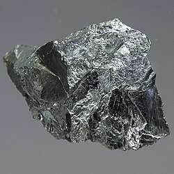 Chromium has a high specular reflection in comparison to other transition metals. In infrared, at 425 μm, chromium has a maximum reflectance of about 72%, decreasing to a minimum of 62% at 750 μm before increasing again to 90% at 4000 μm.[11] When chromium is used in stainless steel alloys and polished, the specular reflection decreases with the inclusion of additional metals, yet is still high in comparison with other alloys. Between 40% and 60% of the visible spectrum is reflected from polished stainless steel.[11] Chromium's high reflectivity, especially the 90% in infrared, can be attributed to chromium's magnetic properties.[19] Chromium has unique magnetic properties; it is the only elemental solid that shows antiferromagnetic ordering at room temperature and below. Above 38 °C, its magnetic ordering becomes paramagnetic.[7] The antiferromagnetic properties, which cause the chromium atoms to temporarily ionize and bond with themselves, are present because the body-centric cubic's magnetic properties are disproportionate to the lattice periodicity. This is due to the magnetic moments at the cube's corners and the unequal, but antiparallel, cube centers.[19] The frequency-dependent relative permittivity of chromium, deriving from Maxwell's equations and chromium's antiferromagnetism, results in increased reflectance at infrared and visible wavelengths.[20]