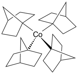Cobaltocene is a structural analog to ferrocene, with cobalt in place of iron. Cobaltocene is much more sensitive to oxidation than ferrocene.[27] Cobalt carbonyl (Co2(CO)8) is a catalyst in carbonylation and hydrosilylation reactions.[28] Vitamin B12 (see below) is an organometallic compound found in nature and is the only vitamin that contains a metal atom.[29] An example of an alkylcobalt complex in the otherwise uncommon +4 oxidation state of cobalt is the homoleptic complex tetrakis(1-norbornyl)cobalt(IV) (Co(1-norb)4), a transition metal-alkyl complex that is notable for its resistance to β-hydrogen elimination,[30] in accord with Bredt's rule. The cobalt(III) and cobalt(V) complexes [Li(THF)