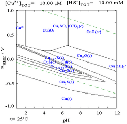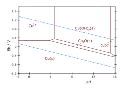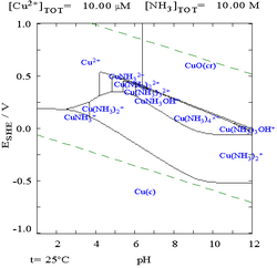 | in pure water, or acidic or alkali conditions. Copper in neutral water is more noble than hydrogen. | in water containing sulfide | in 10 M ammonia solution | in a chloride solution |