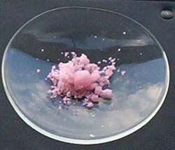 Erbium(III) oxide (also known as erbia) is the only known oxide of erbium, first isolated by Carl Gustaf Mosander in 1843, and first obtained in pure form in 1905 by Georges Urbain and Charles James.[17] It has a cubic structure resembling the bixbyite motif. The Er3+ centers are octahedral.[18] The formation of erbium oxide is accomplished by burning erbium metal,[10] erbium oxalate or other oxyacid salts of erbium.[19] Erbium oxide is insoluble in water and slightly soluble in heated mineral acids. The pink-colored compound is used as a phosphor activator and to produce infrared-absorbing glass.[19]