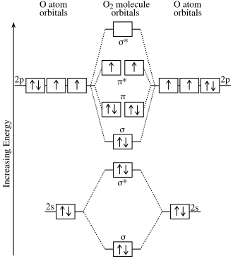 2 molecule is referred to as triplet oxygen.[37] The highest-energy, partially filled orbitals are antibonding, and so their filling weakens the bond order from three to two. Because of its unpaired electrons, triplet oxygen reacts only slowly with most organic molecules, which have paired electron spins; this prevents spontaneous combustion.[38]