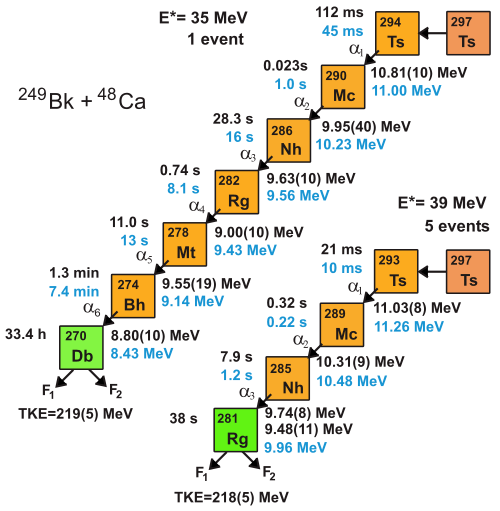 - ^ Zlokazov, V.B.; Utyonkov, V.K. (8 June 2017). "Analysis of decay chains of superheavy nuclei produced in the 249Bk + 48Ca and 243Am + 48Ca reactions". Journal of Physics G: Nuclear and Particle Physics. 44 (7): 075107. Bibcode:2017JPhG...44g5107Z. doi:10.1088/1361-6471/aa7293.