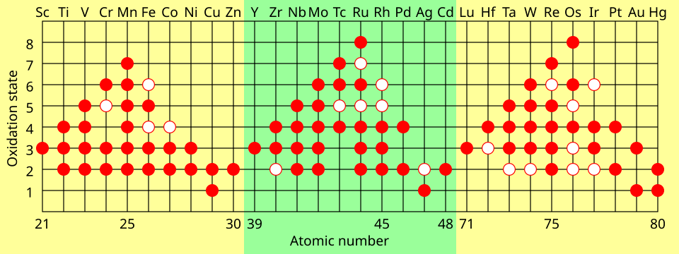 - the formation of compounds in many oxidation states, due to the relatively low energy gap between different possible oxidation states[33]
