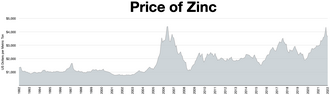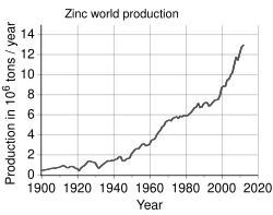 Currently identified zinc resources across the globe total 1.9–2.8 billion tonnes.[40][41] Large deposits are in Australia, China, Canada, and the United States, with the largest potential reserves in Iran.[38][42][43] The most recent estimate of reserve base for zinc (meets specified minimum physical criteria related to current mining and production practices) was made in 2009 and was calculated to be roughly 480 Mt.[44] Zinc reserves, on the other hand, are geologically identified ore bodies whose suitability for recovery is economically practical (based on variables such as location, grade, quality, and quantity) at the time of determination. Since exploration and mine development is an ongoing process, the amount and number of zinc reserves is not a fixed number, and sustainability of zinc ore supplies cannot be judged by simply extrapolating the combined mine life of today's zinc mines. This concept is well supported by data from the United States Geological Survey (USGS), which illustrates that although refined zinc production increased 80% between 1990 and 2010, the reserve lifetime for zinc has remained unchanged, through the discovery of additional zinc deposits. About 346 million tonnes have been extracted throughout history up to 2002, and scholars have estimated that about 109–305 million tonnes are presently in use.[45][46][47]