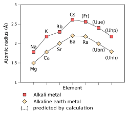 Los radios iónicos de los metales alcalinos son mucho más pequeños que sus radios atómicos. Esto se debe a que el electrón más externo de los metales alcalinos está en una capa de electrones diferente a la de los electrones internos y, por lo tanto, cuando se elimina, el átomo resultante tiene una capa de electrones menos y es más pequeño. Además, la carga nuclear efectiva ha aumentado y, por lo tanto, los electrones son atraídos con mayor fuerza hacia el núcleo y el radio iónico disminuye.[116]