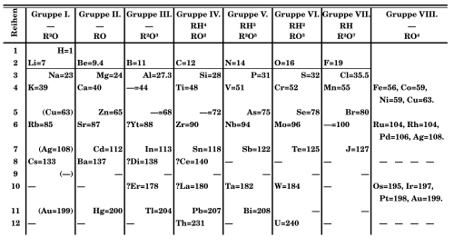 Alrededor de 1865, John Newlands produjo una serie de documentos donde enumeró los elementos en orden de aumento del peso atómico y propiedades físicas y químicas similares que se repetían a intervalos de ocho; comparó esa periodicidad con las octavas de la música, donde las notas separadas por una octava tienen funciones musicales similares.[23][24] Su versión reunió todos los metales alcalinos conocidos (litio a cesio), así como cobre, plata y talio (que muestran el estado de oxidación +1 característico de los metales alcalinos), en un grupo. Su tabla colocaba hidrógeno con los halógenos.[25]